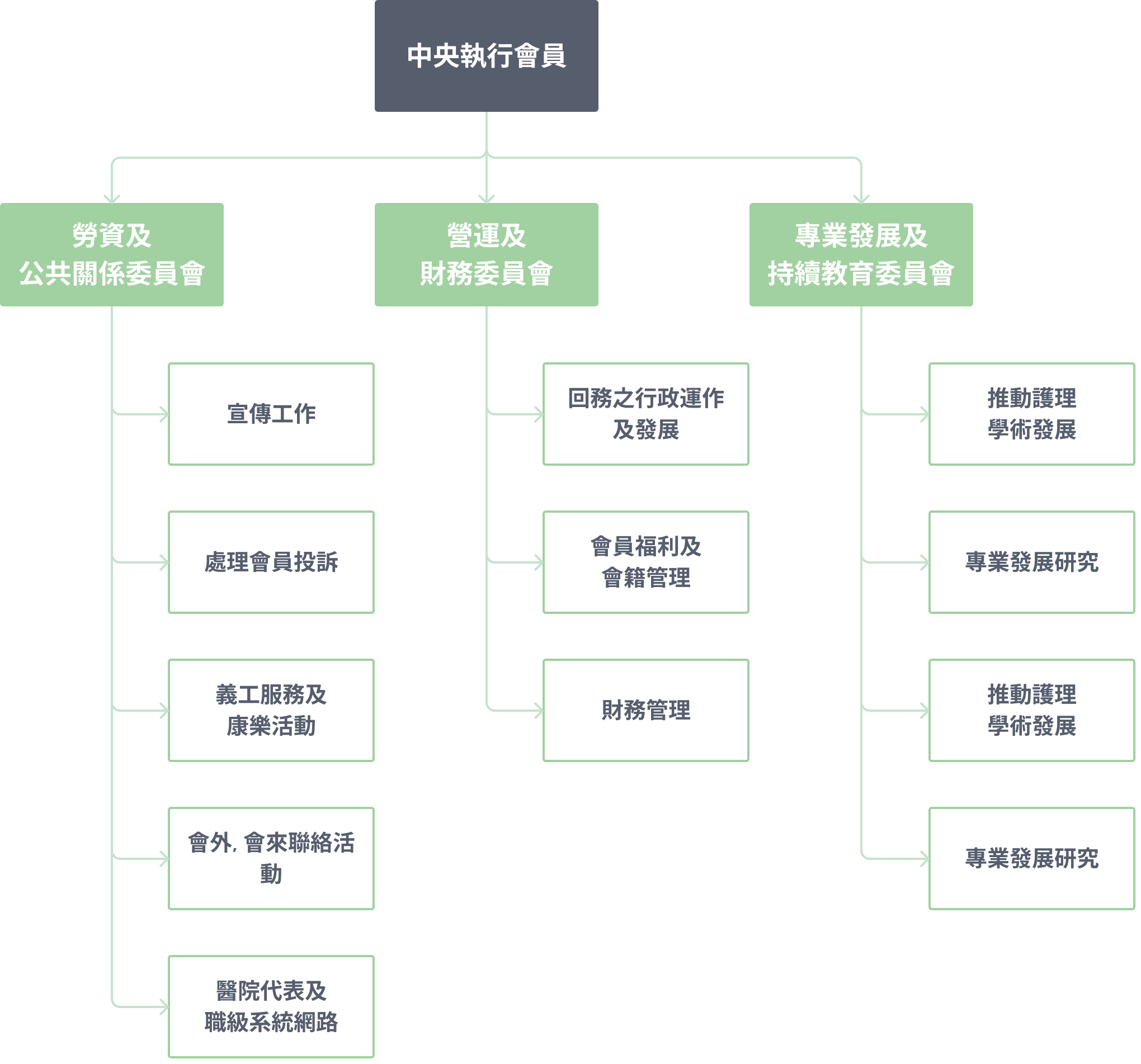 中央執行委員會的成員分成三個委員會,分別為勞資及公共關係委員會 (Industrial & Public Relation Committee) 、營運及財務委員會 (Operations & Finance Committee)、專業發展及持續教育委員會 (Professional Development & Continuing Education Committee),以制定發展方向及政策,向會員提供多元化服務。各組別分工發展會務。